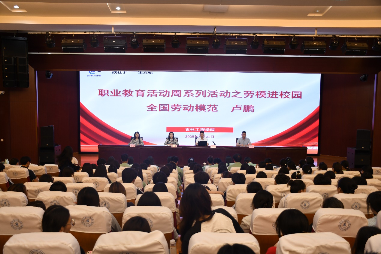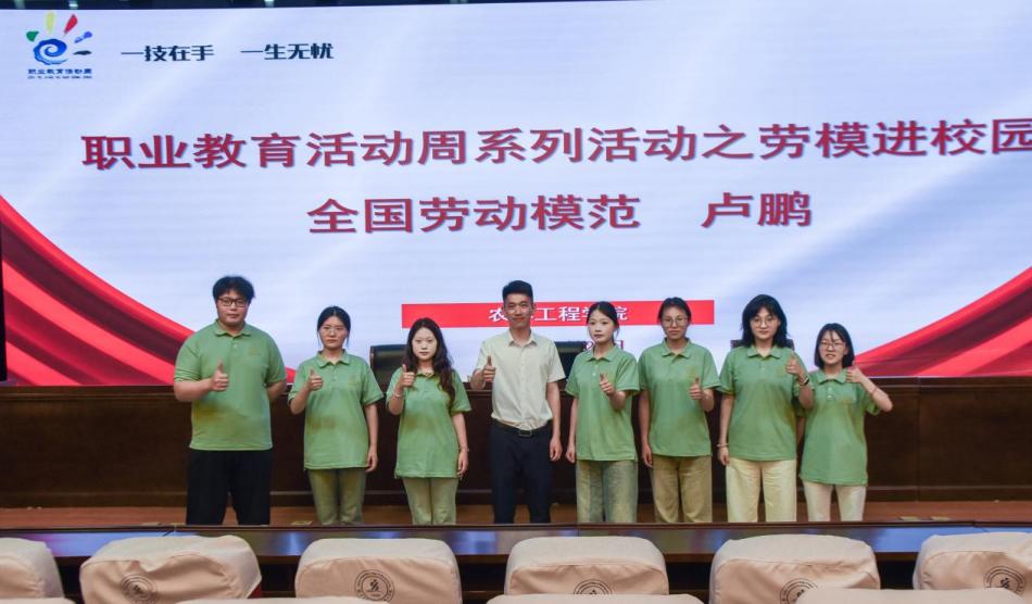 为大力弘扬劳模精神、工匠精神,营造“劳动光荣、技能宝贵、创造伟大”的时代风尚,5月21日下午,由教务处主办农林工程学院承办的职业教育活动周系列活动之劳模进校园在学术报告厅举行。活动邀请全国劳动模范卢鹏到校宣讲。教务处处长王兵、农林工程学院院长陶佩琳、师生代表等200余人参加活动。活动由农林工程学院副院长关滢主持。