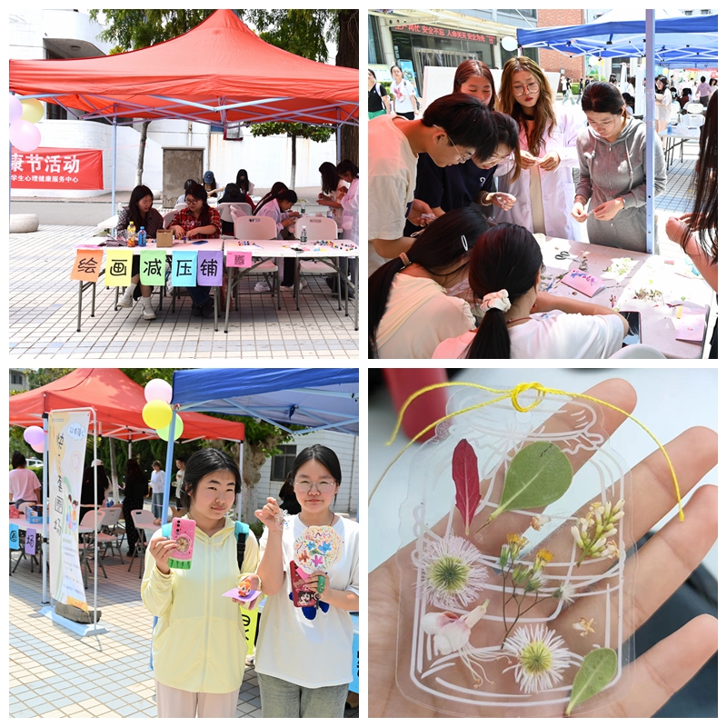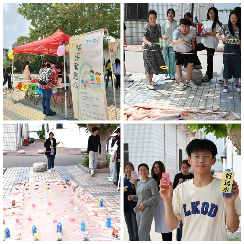 活动采用“心理集市”形式,开设“绘画减压铺”、“解忧杂货店”、“心灵解密屋”、“快乐套圈场”等摊位,以手工制作、绘画涂色、写感恩信、传递快乐梦想纸条、心理测验、套圈游戏等十多项丰富多彩的活动形式,充分调动师生的参与热情。参与者在各摊位完成活动任务获得幸运章,集幸运章即可领取心理健康自助手册、盲盒纪念品,还可在“快乐套圈场”换取套圈次数,活动现场洋溢着欢乐的氛围,充分展示了大学生乐观积极的阳光心态。