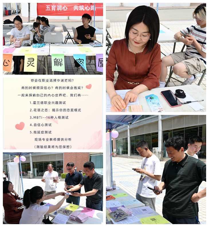 为落实立德树人根本任务,提升大学生心理健康素养,5月22日,校心理健康服务中心协同大学生心理健康协会,在食堂前广场面向全校师生开展“五育润心 共筑心路”“5.25我爱我”心理健康节活动。