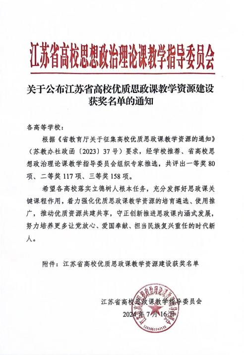 近日,江苏省高校思政课教学指导委员会发布《关于公布江苏省高校优质思政课教学资源建设获奖名单的通知》。本次评选活动分为“新时代伟大变革”专题、教学重点难点精讲教案和优秀教学案例3个类别。经评审,我校马克思主义学院教师张见撰写的案例《如何建设社会主义现代化强国》荣获“教学重点难点精讲教案”类别三等奖。